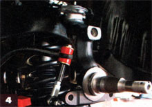 8. Calipers are also marked for left and right to simplify installation. Each caliper comes loaded with high-metallic pads (same as the original equipment on ZR-1 corvettes) and slide right in place. Secure with the supplied 9/16-inch bolts and torque to 105 ft-lb. Install the supplied braided hose and banjo-style fittings, and the front is ready for the proper bleeding procedure when the balance of the has been completed. Readers will also note new Global West Suspension tubular control arms installed at this point.