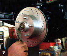 7. With the proper rotation noted, the hubs are installed onto the spindle with the keyed washer and castle nut. The hubs come preassembled from Baer with Timken bearings, races and National seals packed in Redline synthetic grease. Baer stresses to only tighten just past finger-tight while rotating the rotor to allow for thermal expansion.