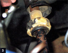 2. Though our main objective was to restore turn-signal capabilities to our subject Malibu, the lower end of the steering column was also needy. The column adapter (arrow) was brittle and broken, and it had totally lost the lip that holds it in place on the column end.
