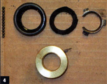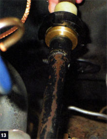 13. The adapter got a coat of high-heat black paint before our replacement bronze bushing upgrade was pressed into place. We slit the steering-shaft clamp into place inside the car, followed by the brushing/adapter combo. The retaining clip would be installed after the column was in its final position.