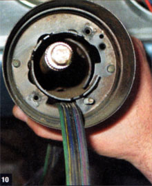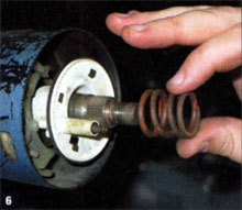 6. After removing the steering wheel with the appropriate puller, this spring and the signal-cancel cam (which also incorporates the horn contact on its backside) could be removed.