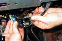 8. Before proceeding any further, we disconnected the battery and unplugged the steering-wheel harness. The gray wire at the top had to be unhooked from the harness. Inserting a very small screwdriver into the socket to unhook the wire worked well.