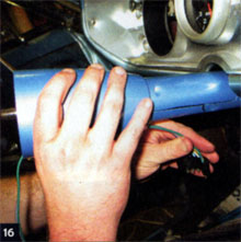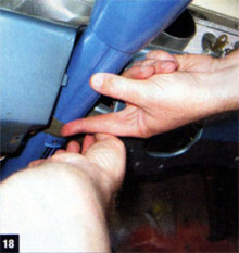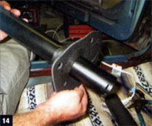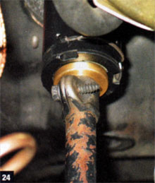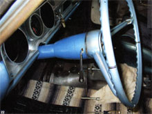 24. With the column now in place, Harrigan reached up to tighten the steering-shaft clamp against the bronze bushing, holding the shaft in place and providing the proper 1/16-inch clearance between the steering wheel and the column. With the adapter clip set in place, we were all but set.