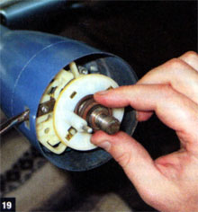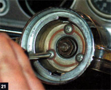 19. After the Malibu’s long-unused turn-signal lever was reattached, a new cancel cam went into place atop the new turn-signal switch, followed by the steering-wheel tension spring.