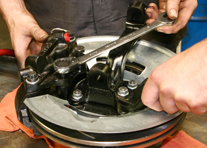 The caliper is secured to the caliper mounting bracket with grade 8 bolts and lock washers.