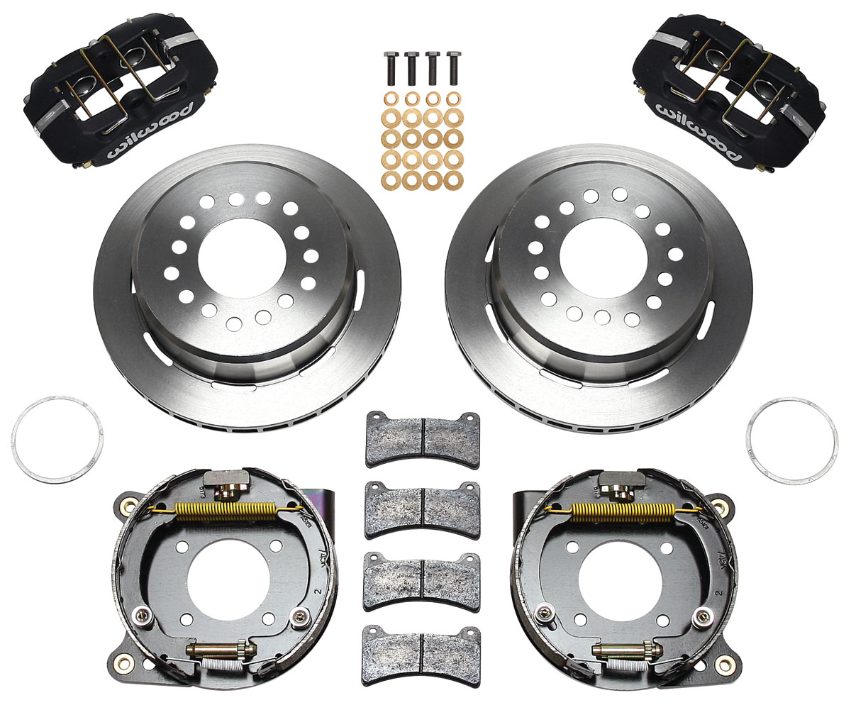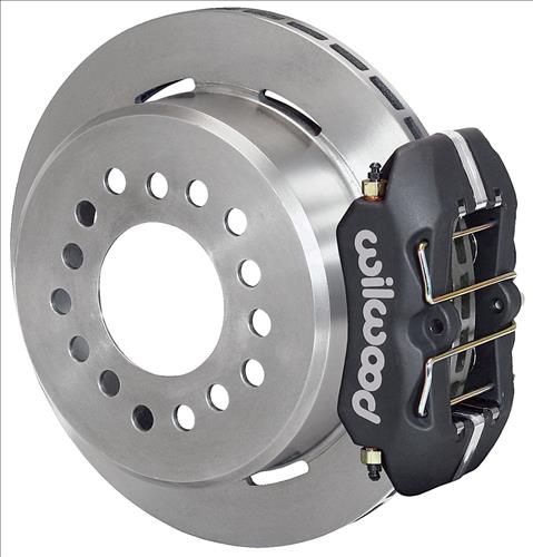 The DynaPro Low-Profile disc brake kits are the perfect solution for adding rear disc brakes to a car with 14” or 15” wheels. These kits feature a Wilwood forged billet 4-piston Dynapro caliper loaded with high-performance brake pads for a tight grip on the one-piece 11” hat and rotor assembly. Keeping with a clean and simple theme, the shoe-style parking brake is hidden inside the brake hat and provides excellent static holding power to keep your car in place. A variety of rotor and caliper finishes allow you to achieve the look you desire. Parking brake cables are sold separately. The direct bolt-on kit is ready for installation on your 10-bolt, non C-Clip differential with 2.75" bearings.