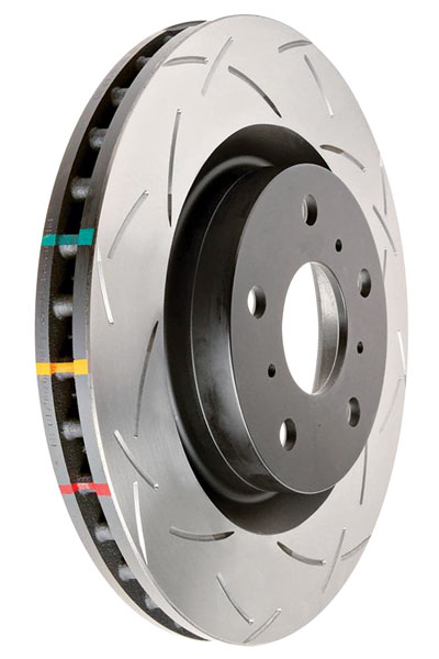 4000 series one-piece rotors have a friction surface that is manufactured from XG105 high-carbon alloyed iron with an increase in thermal capacity and feature 48 precision CNC machined slots in a tri-symmetrical curve design to damp the vibration harmonics or noise resulting in a quieter, more responsive, and smoother brake pedal feel due to the increased number of out-gassing points. These rotors feature a Kangaroo Paw ventilation system consisting of 144 diamond and tear drop style internal pillars minimizing brake fade and increasing braking effectiveness, outperforming traditional straight-vane rotors by up to 20%. All DBA rotors have heat paint markings that change color at specific temperatures allowing the driver to monitor rotor fatigue.