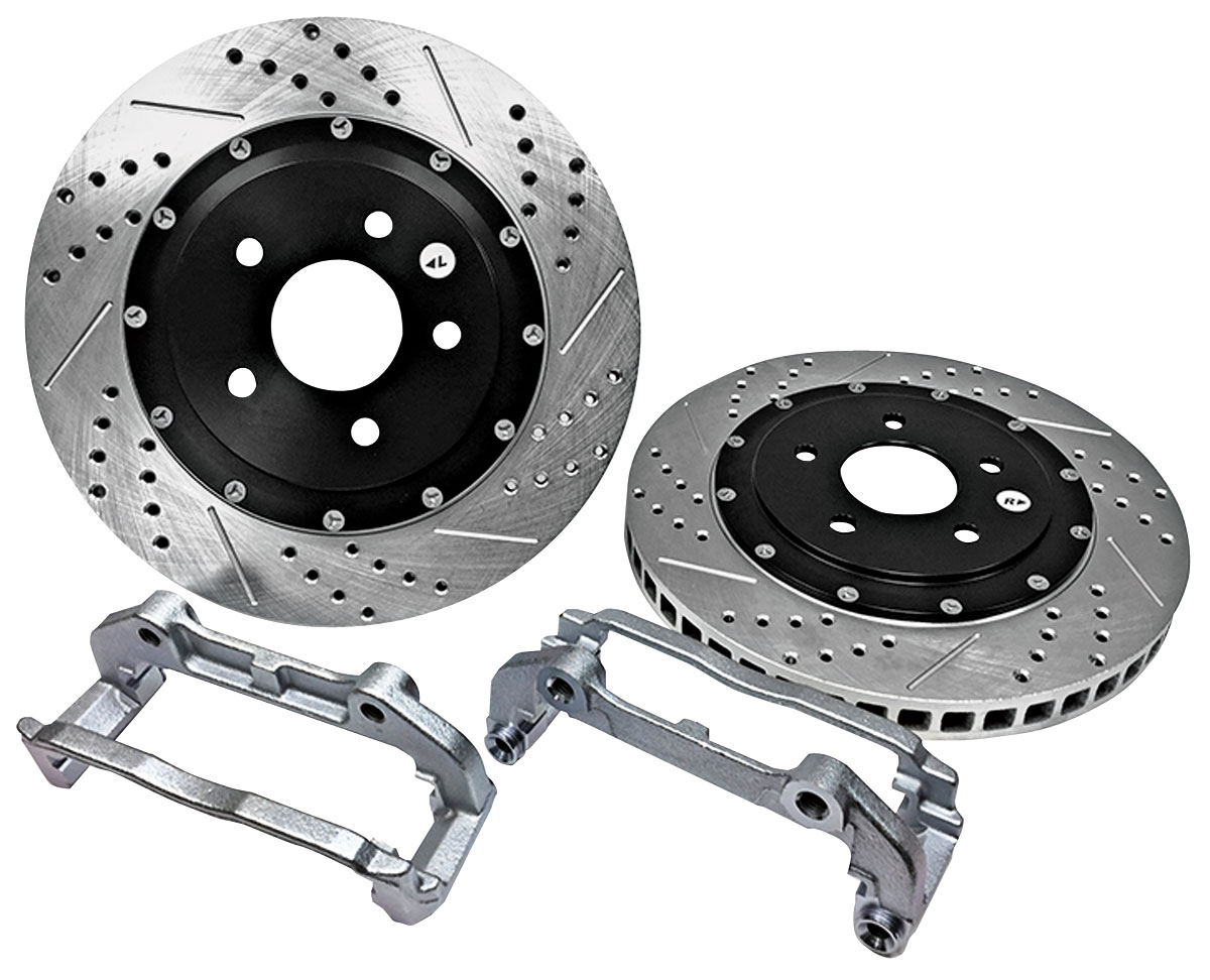 The EradiSpeed+1 rotors are a two piece design that features curved vane rotor ring mounted to a 6061-T6 billet aluminum center hat using NAS aircraft hardware. The ES+1 rotors are direct bolt on replacements that retain the OE caliper with the use of caliper relocation brackets. Features include increased brake torque due to increased diameter, better cooling with the curved vane design and enhanced appearance. Eradispeed+1 rotors come standard with a cross-drilled, slotted and zinc plated finish. Includes rotor and hat assemblies, caliper relocation brackets and all necessary hardware. Easy installation, no bleeding of the brakes required. Minimum 18" wheel recommended.