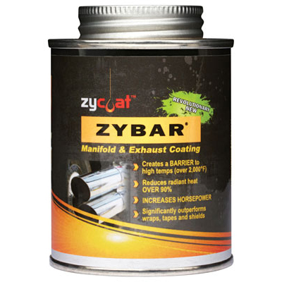 Zybar is a specially formulated coating designed to conquer extreme temperatures of up to 2000°+F in automotive applications. The perfect do-it-yourself heat dissipation coating, Zybar can be sprayed, dipped or wiped onto your clean surface. Not only will Zybar create an outstanding appearance, but it also improves performance and fuel economy, while resisting rust and corrosion. The lightweight formula can be air cured or baked in a home oven for faster results. Available in 4-colors, Zybar is perfect for headers, manifolds, mufflers, tailpipes and tips. Available in 4, 8, 16, or 32oz. cans.