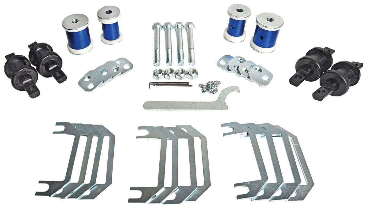 Kit includes: • 4 - Upper ball shaft pivot assemblies -- assembled • 4 - Del-a-lum lower bushing assemblies • 1 - LOC-56 lock out kit includes hardware • 1 - SMK-56 alignment shim kit • 1 - Spanner wrench • 16 - Set screws • 2 - Center punches • 1 - Allen wrench