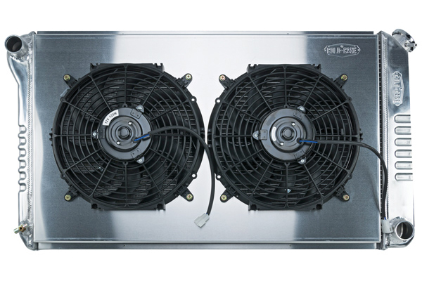 These direct-fit 100% TIG welded Cold-Case aluminum radiators feature polished OE style tanks that accept original radiator caps, two 1.25" oversized rows (unless noted otherwise), and dual 12" electric fans inside a direct-fit aluminum shroud altogether moving 2800 CFM of air. Each radiator is pressure tested before it leaves the factory. Includes fittings for automatic applications. Harness sold separately.