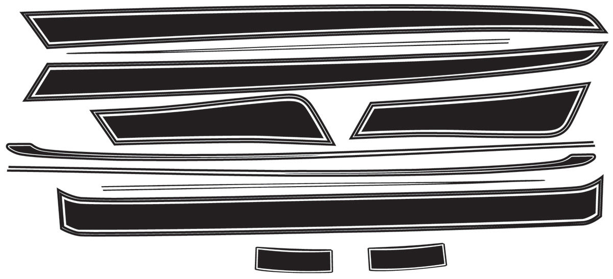 COMPLETE PACKAGE: (2) Front fender stripes (2) Top fender stripes (2) Door stripes (1) Roof stripe (2) "B" pillar stripes (2) Rear quarter panel stripes Squeegee and instructions