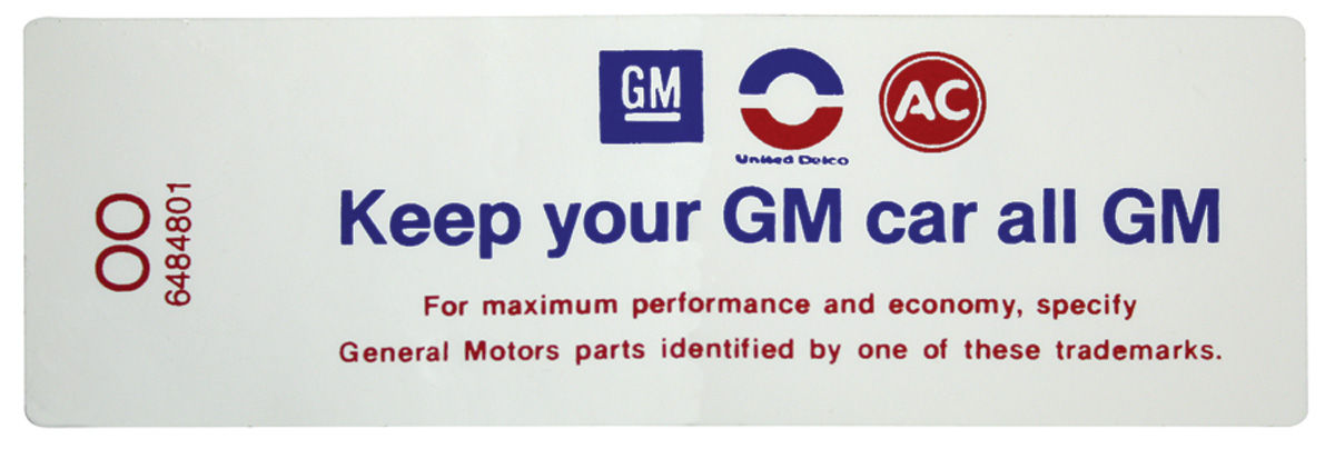 These "side of air cleaner" base decals are identical to the original GM ones when new from the factory. Convenient peel and stick backing makes applying these decals simple!