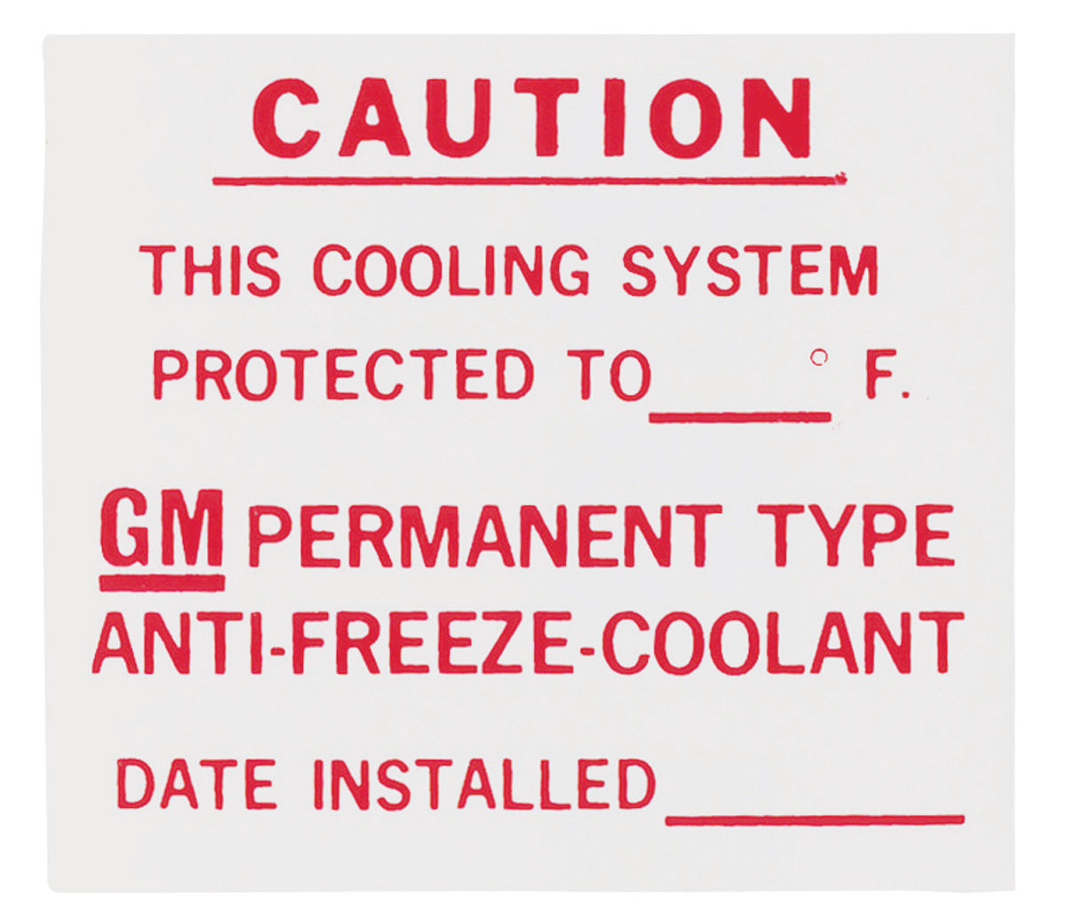 New cooling system decal is identical to what was originally used on the Cadillac assembly line. Each decal features the factory-correct markings for the fan and coolant in order to maintain an original appearance.