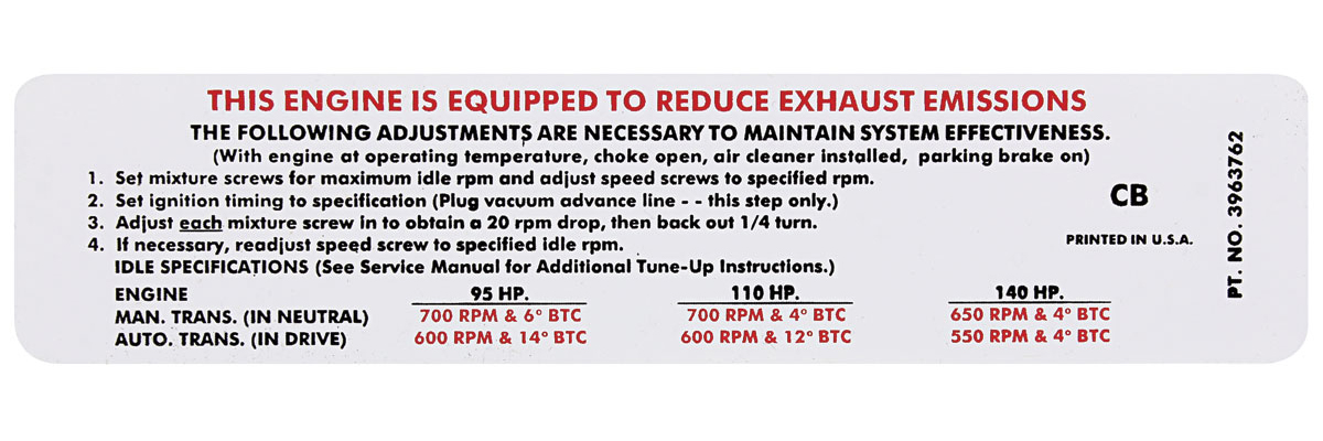 Authentic emissions decals are available to add detail and credibility to your restoration. Each application specific decal features durable peel and stick backing just like original equipment. Satisfaction guaranteed!