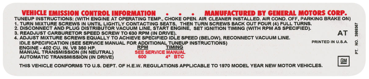 Decal, Emissions, 1970 Chevelle/El Camino/Monte Carlo, 402 350HP, AT