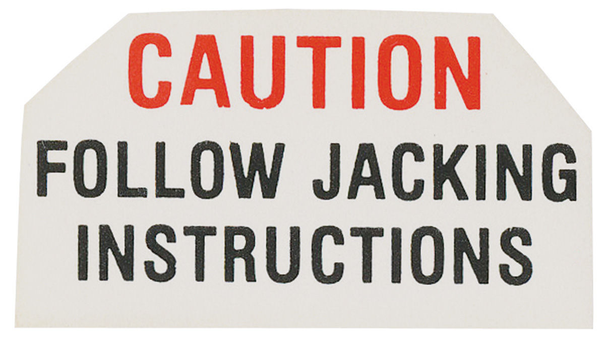 This reproduction decal is identical to the original warning decal that was installed at the factory. Each decal advises the user to follow the posted jacking instructions to avoid mishaps and possible injury.
