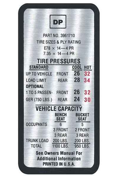 Decal, Tire Pressure, 1969-70 Chevelle, DP 3961710