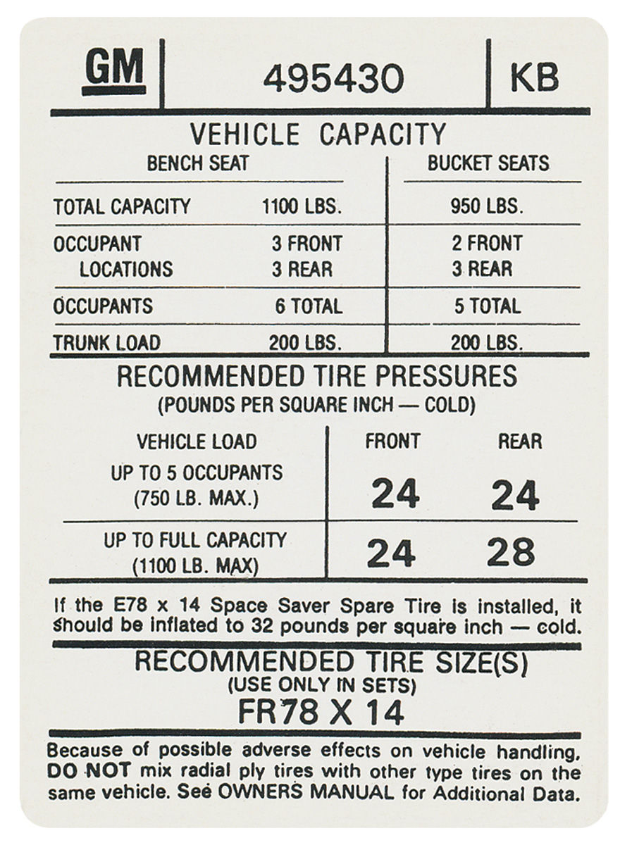 Decal, Tire Pressure, 1974 GTO/Tempest/LeMans, KB