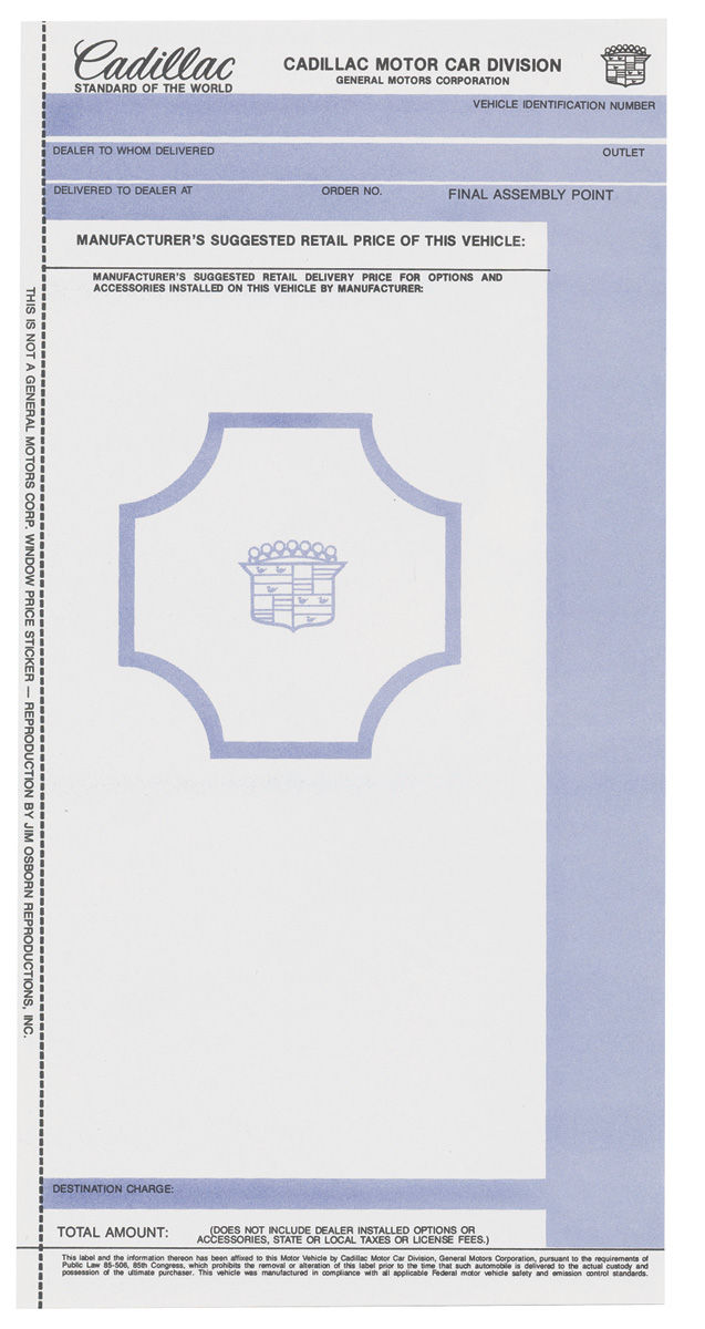 New car window sticker is identical to what was found on dealer lots in the 1970s. The authentic reproduction is shipped blank and feature space for VIN, model, dealer location, options, tax and total cost.