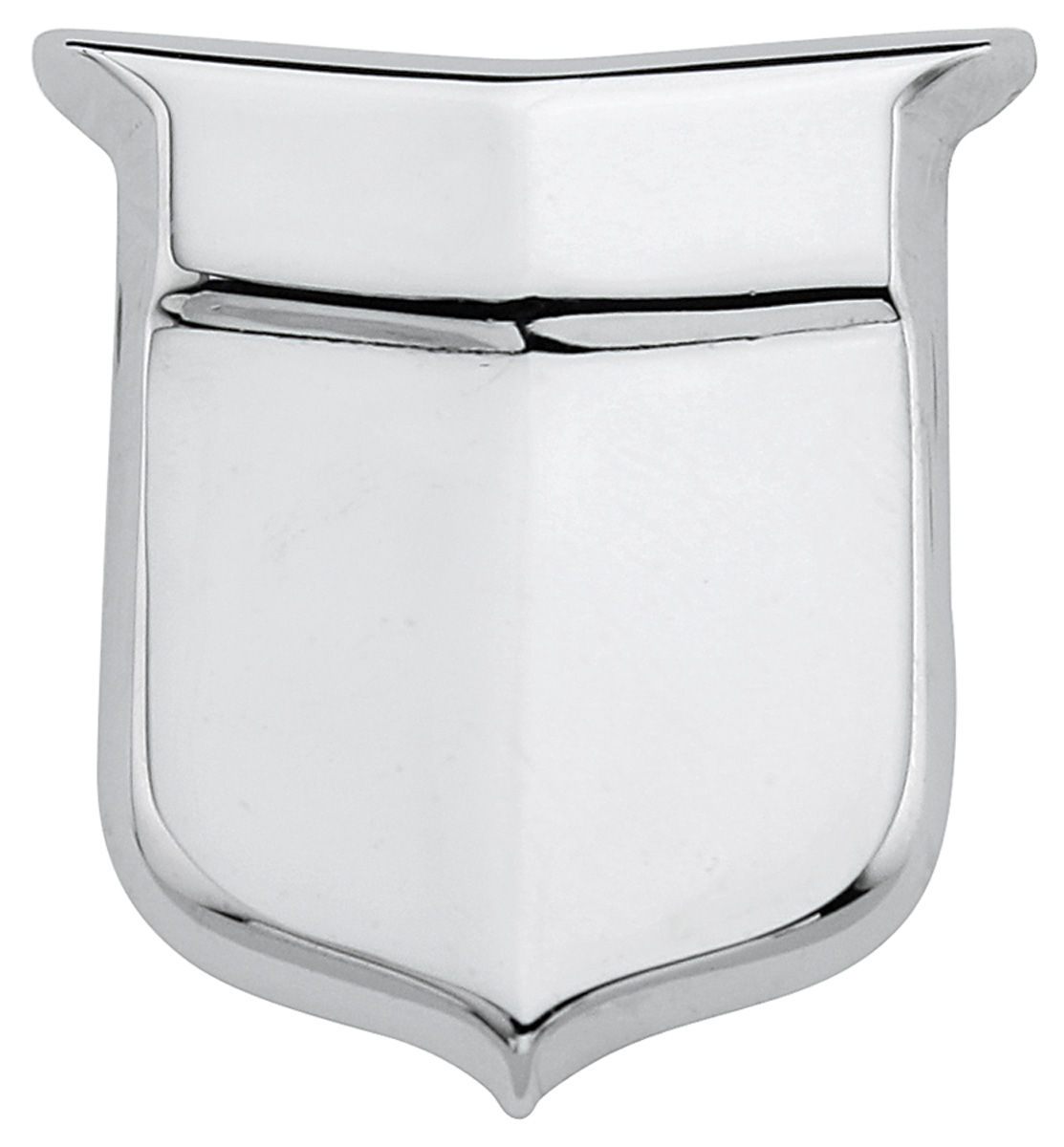 Reproduced to original specifications, these fender tip crest emblems are cast and chrome-plated for a factory-correct appearance. The bottom portion of the emblem is polished, while the upper features a brushed finish for authenticity. Each emblem features a single 6-32 threaded stud and hex nut for fastening, as well as a single locating pin for precise installation.
