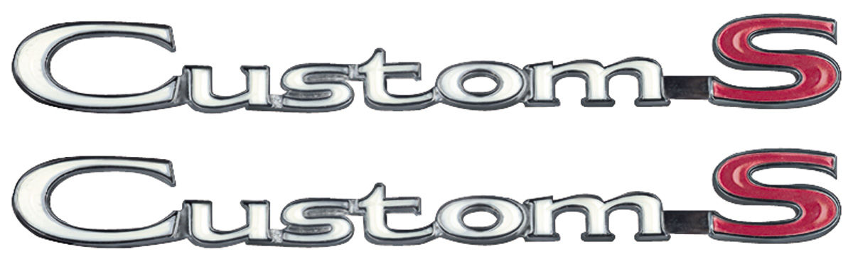 Precise "Custom S" nameplate is guaranteed in fit and finish. Bold baked-on enamel off-white (like factory) paint and brilliant red "S" rounds out this detailed reproduction.