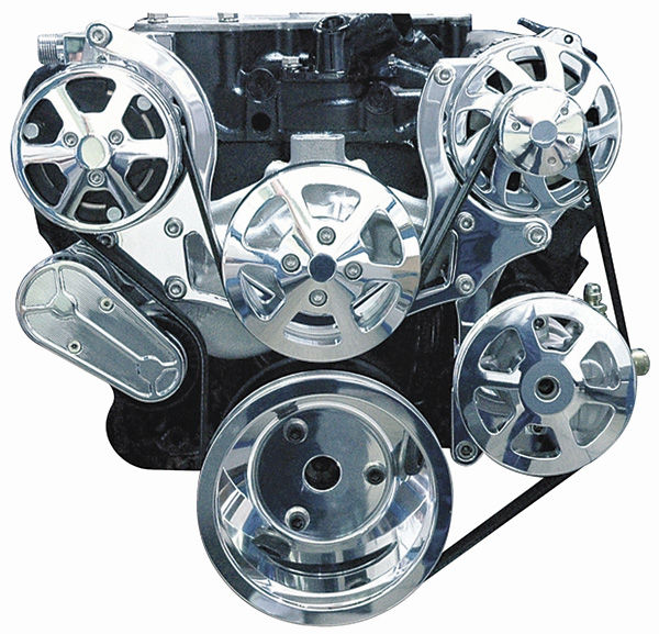 This complete pulley drive system is the ideal conversion for any Chevrolet V8 engine. Easily eliminate your original v-pulley system and bolt on the "S-Drive" for a modern serpentine drive system. Each "S-Drive" system features CNC-machined aluminum brackets, pulleys and covers as well as the top-of-the-line components listed below. Powermaster 105 amp alternator (140 amp for LS models) Edelbrock water pump Sanden SD-7 compressor (where applicable) Maval power steering pump Gates serpentine belt Gates tensioner ATI damper (LS models) Choose from one of several styles to fit your specific need. We have complete kits that feature power steering and air conditioning as well as kits designed for manual steering or heater-only applications. Kits are available in either a machined or a polished finish, which features a polished brackets and pulleys as well as water pump, AC compressor and alternator. Satisfaction guaranteed!