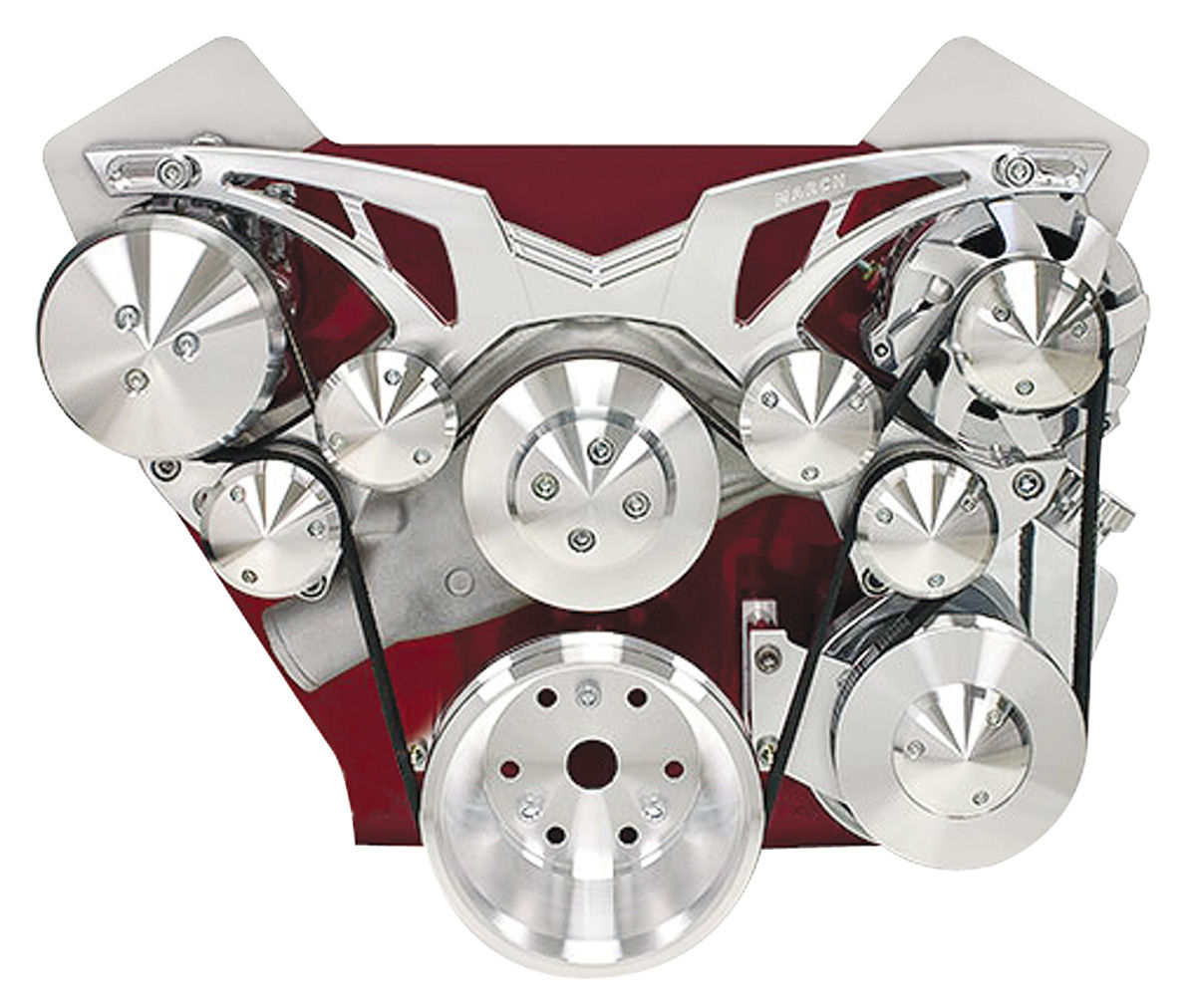 SOLD COMPLETE, THESE KITS INCLUDE: – 105-amp chrome alternator – Alternator pulley with fan and nose cover – Matching chrome AC compressor – Aluminum water pump and pulley – Alternator and AC bracket – Necessary idlers – Belt tensioning tool – All necessary hardware – GM Type two power steering pump (where applicable) – Power steering pulley with nose cover (where applicable) – Bracket with mounting hardware (where applicable)