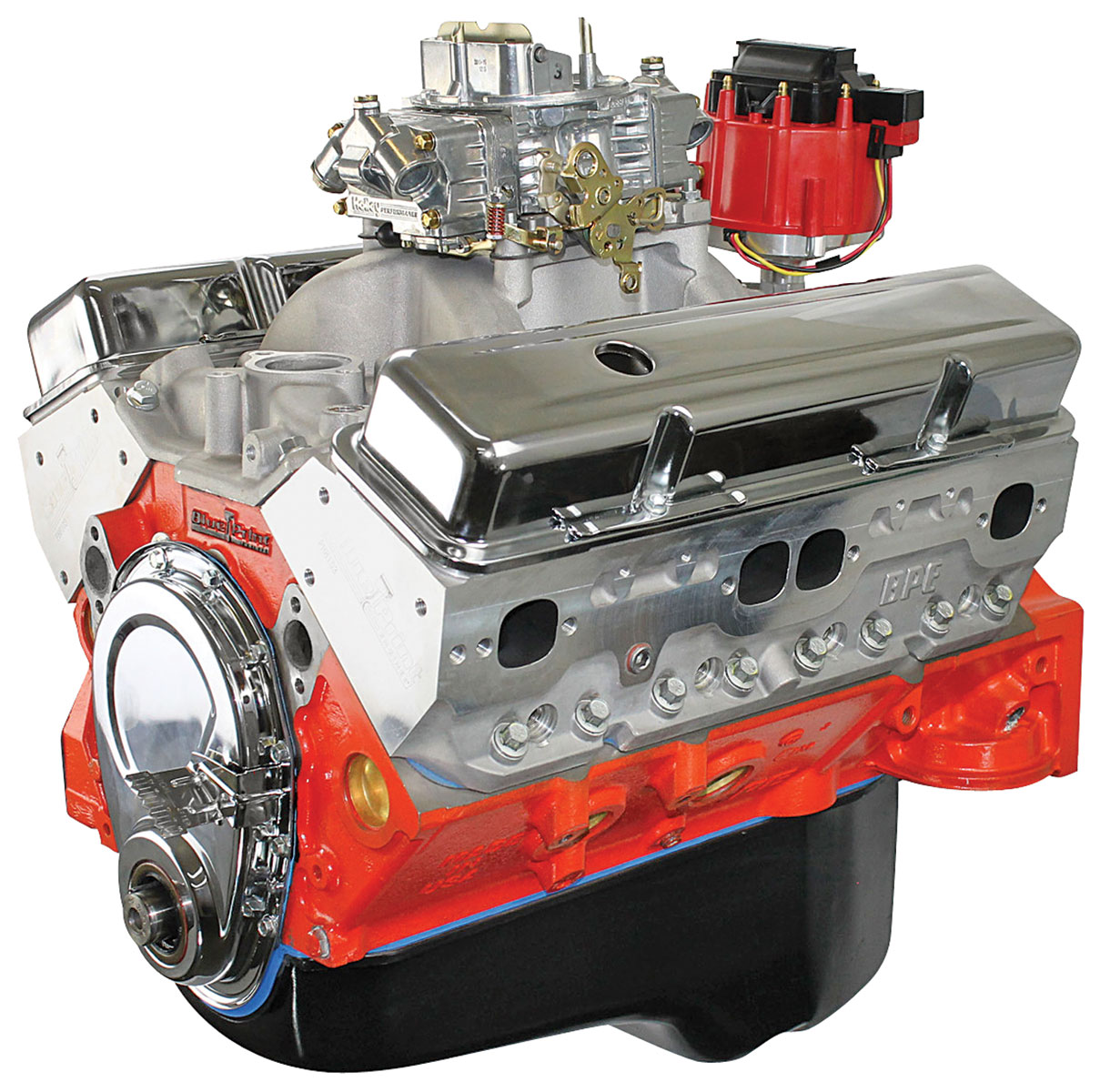 TECHNICAL SPECIFICATIONS HP & Torque: 436 HP / 443 FT LBS Compression Ratio: 10.0:1 BluePrint Performance Aluminum Heads Hypereutectic Pistons Roller Cam Cast Steel Crank BLOCK: NEW BluePrint Cast Iron Block Manufactured and Machined in the USA! 4-Bolt Main 4.000" Bore 1-Piece Rear Main Seal Mech fuel pump provision: Yes Passenger Side Dipstick Drilled and tapped for clutch linkage ROTATING ASSEMBLY: New BluePrint Cast steel crankshaft 3.750" Stroke OEM type 5.700" connecting rods w/ 150,000 psi bolts Hypereutectic pistons External Front/ External Rear CYLINDER HEADS: BluePrint Performance Aluminum Heads 64cc Chamber 2.02 Swirl Polished Intake Valves 1.60 Swirl Polished Exhaust Valves Hardened Retainers and Springs CAM SPECS: Cam Type: Roller .544 Intake .555 Exhaust 230 Intake / 236 Exhaust duration @ .050, 110 ° lobe separation angle IGNITION TIMING: Initial timing - 10-16° and Total timing 32-34° at 3500 RPM ALSO INCLUDES: Dual Plane, Satin Aluminum Intake Manifold Holley 750cfm Carburetor - Manual Choke or Holley Sniper EFI New Chrome Timing Cover Distributor Melling High Volume Oil Pump New Chrome Valve Covers Painted Oil Pan Passenger Side Dipstick Dyno test results shipped with engine WARRANTY: 30 month / 50,000 mile NOTES: Not for EGR. Recommended Oil: BPP710 BluePrint Crate Engine Break In Oil Recommended Harmonic Balancer: BPP400 Recommended Stall Converter: 2000 to 2400 RPM. Recommended Fuel: 91 Octane. The Aftermarket intake manifold installed on this engine may not be compatible with OEM accessory brackets that use intake mounted bosses. This engine features a true 4 inch bore, which mathematically yields 377 CID with a 3.75 inch stroke. The performance aluminum cylinder heads on this engine feature a .500 raised port vs OEM.