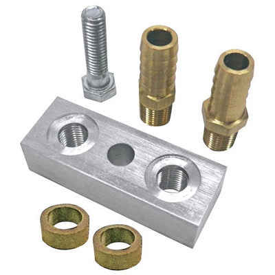 Easily install an external oil cooler with this billet aluminum adapter kit from OPGI. Machined from premium billet aluminum, the adapter bolts to the stock oil cooler location and allows you to mount a cooler in the location of your choice. Each kit includes two barbed oil line fittings, viton oil cooler seals and a mounting bolt for installation.