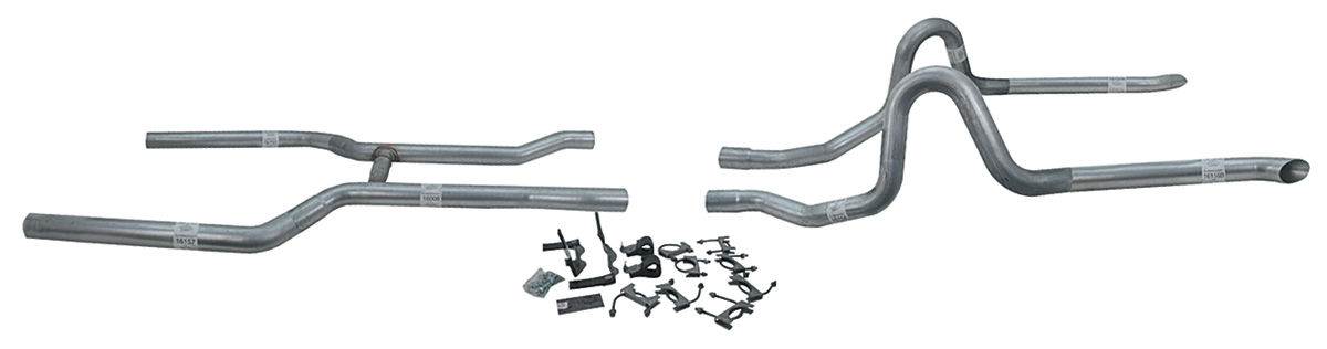 Exhaust System Features: Dual Tailpipe Exit Styles with Turndown or Angle-cut Tailpipes Includes all Clamps, Hangers and Necessary Hardware Mandrel-bent 2.50-inch Aluminized Steel Tubing Extra Long Front Pipes for Adjustability 3-year Limited Warranty Includes Built-in H-pipe Muffler Features: No internal packing to blowout Excellent Street/Strip and Off Road application Race proven Delta Flow technology Durable fully welded 16 gauge aluminized steel