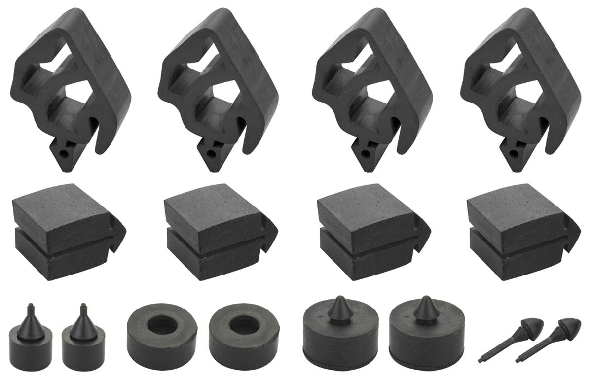 These complete kits include exact reproductions of the original rubber bumpers found on the doors, trunk lid, hood, side of hood, gas tank door and interior glove box. Does not include tailgate bumpers.