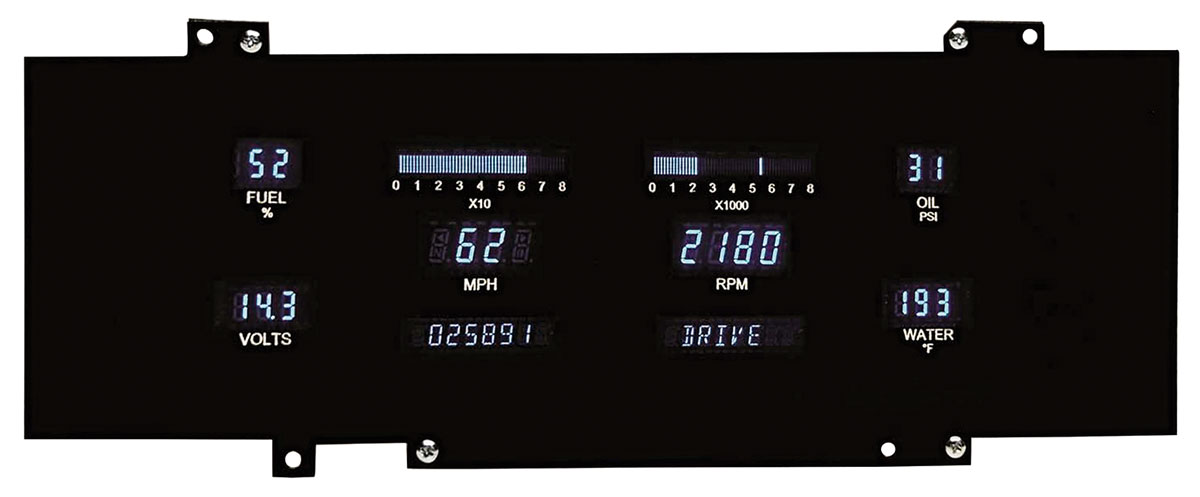 Dakota Digital VFD3 direct-fit digital instrument systems deliver high brightness vacuum fluorescent displays that provide a lifetime of trouble-free use, while offering increased accuracy. These Dakota Digital Series III instrument systems are equipped with the latest technologies and features for a wide variety of applications that covers it all. Mount the included pushbuttons supplied with your gauges in a convenient and easily accessible location. These buttons calibrate your speedometer, set the cylinder count and the fuel level gauge. Fully adjustable warning points alert the user of potential vehicle problems. Full 6 gauge instrument system fits into your OEM bezel. Metric systems are also available in KM/H and degree Celsius.