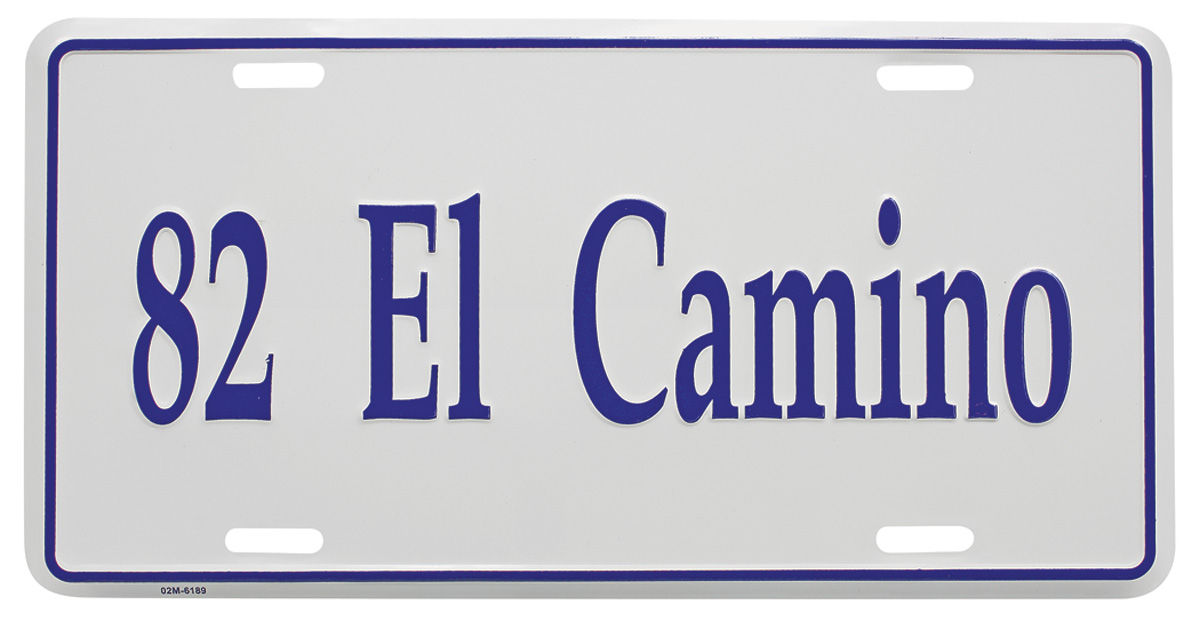 These quality license plates are white with dark blue lettering. Plate comes inscribed with "El Camino" and the year of your choice, 1978 through 1987.