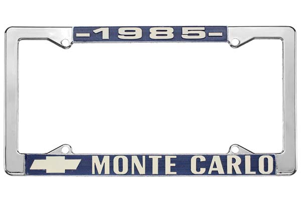 These die-cast, triple chrome-plated frames have a "baked-on enamel" blue background with cast raised lettering.