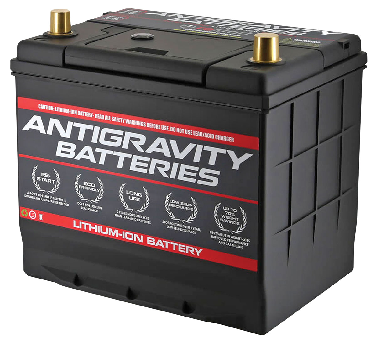 Never stranded again… Antigravity Batteries amazing RE-START Technology is the first battery ever to offer Wireless Remote-activated built-in Jump Starting. (Can also be activated manually by pressing Restart button on top of battery.) So it won’t allow you to get stranded with a dead battery! You left your lights on, the intelligent Battery Management System (BMS) in the battery would put itself to sleep before being drained dead, yet save just enough energy to start your vehicle again and get you out of that emergency. And with the WIRELESS REMOTE KEYFOB you can activate the Jump-Starting without ever opening the hood of the car. Simply press the Keyfob Button, start your car and drive away. The Antigravity Batteries RE-START system offers the latest technology for the safest, longest life cycle possible. The superior on-board Battery Management System (BMS) offers Safety Circuitry to prevent Over-Discharge and Over-Charge, and has Short-Circuit protections, while additionally offering Cell Balancing and Thermal protections. These advanced features of the BMS make the battery not only as safe as possible, but also extend the life of the battery by keeping the battery in the prime operating zone and not allowing damage to the battery. Therefore creating the longest possible Life Cycle. From 7-9 years are expected from the Antigravity RE-START Batteries depending on use and climate. The ultralight Antigravity RE-START Batteries weigh from 8.5 lbs to 16 lbs (4-7 Kg) depending on the model. On average this equates to a weight loss from 35- 60 lbs (16-27 Kg) over a typical lead/acid battery! The incredible weight savings will increase your vehicle’s performance in several key areas such as handling, allowing shorter braking distances, improved acceleration and even better gas mileage. The high cranking power of the Antigravity Lithium-Ion Battery can start Motors up to 900 Horsepower easily! Additionally for even more weight loss you can go with a smaller Amp Hour Battery if you want the lightest weight possible. Power will rarely be an issue being our small batteries will easily turn over Hi-Performance Motors up to 600 Horsepower!