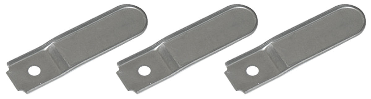 These factory-correct retainers are stamped from heavy-gauge steel using OEM-correct dimensions for a perfect fit and finish. Each retainer features one rounded edge and one squared edge as well as a pre-drilled hole for bolt-in or weld-in mounting. Hold downs are sold per three-piece set.