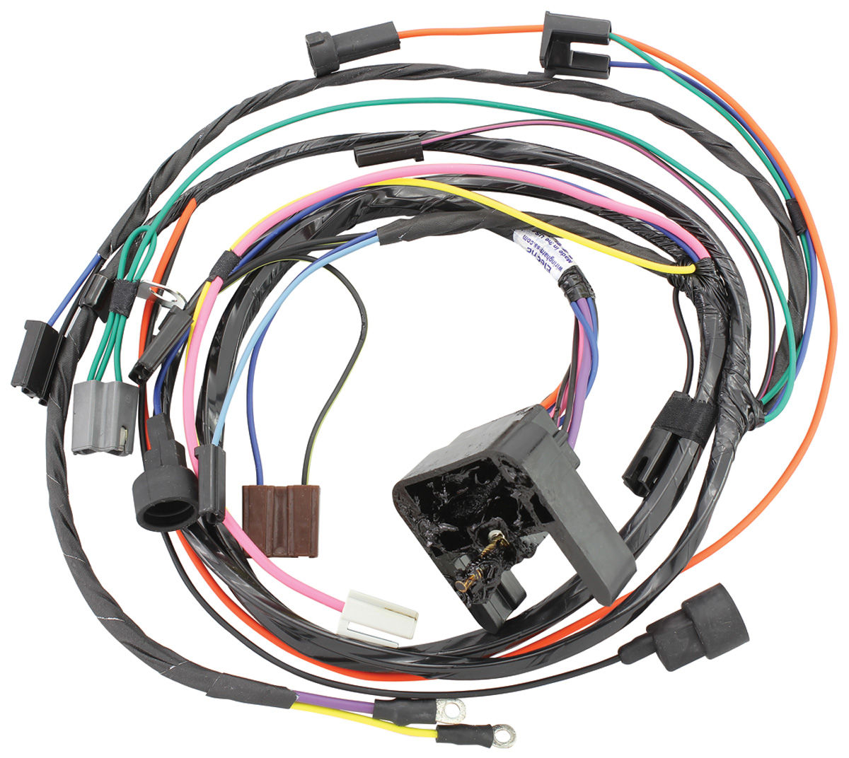 This harness is one of two (the other being the forward lamp harness) located in the engine compartment. It includes the wiring for the solenoid, motor, heater blower, coil, tachometer (1968 and up), wiper motor, oil pressure light, brake warning lights and idle stop solenoid (1969 only).