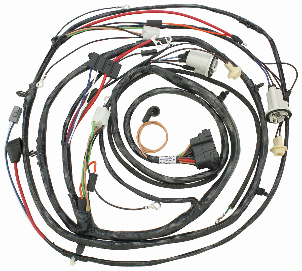 This harness is located in the engine compartment and covers the wiring for the headlights, battery, park lamps, side marker lamps (1968 and up), horn, alternator, temperature sensor and amps gauge.