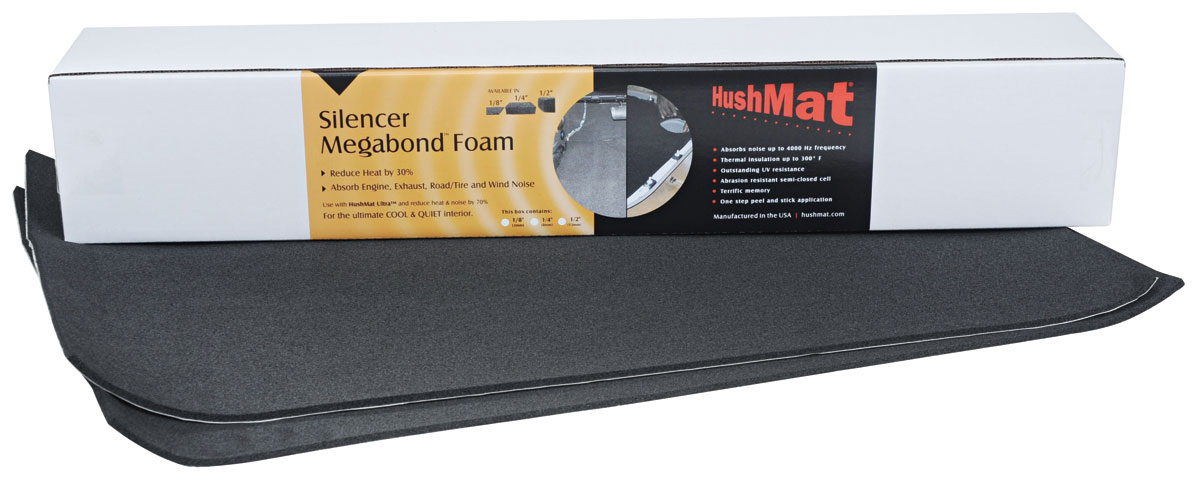 Absorb and eliminate high frequency airborne noise that enters the vehicle by using Silencer Megabond sound deadener from HushMat. Made in the USA using light weight and self-adhesive material, HushMat Silencer Megabond will not only eliminate those annoying road noises, but also reduce the heat that comes from the engine, headers, exhaust, and catalytic converters. Similar to the application of foam on the ceiling and walls of a recording studio, the Silencer Megabond sound deadener performs the same function for the interior of your vehicle and is guaranteed to make a difference in your driving experience. - Manufactured in the USA for over 33 years - 11.5 Square Feet total - Lightweight at 0.10 pounds per square foot - Easily forms and molds to uneven surfaces - Reduces noise over 50% and thermal over 40% - Guaranteed to adhere for the life of the vehicle - No odor - Self Adhesive Peel & Stick material - 1/4" thickness