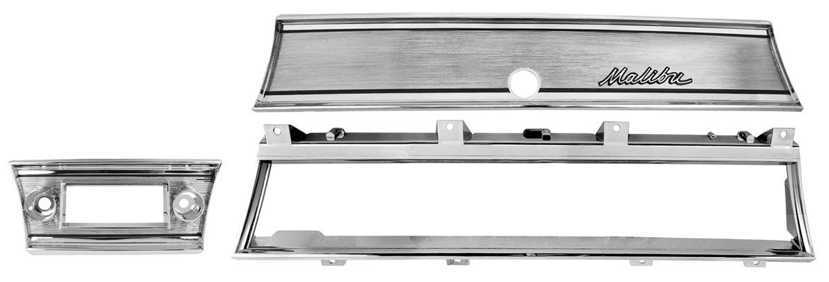The glove box bezel is a highly detailed reproduction that feature the authentic emblem along with the fascia itself. Also included is the radio bezel made from high-impact injection-molded plastic in new molds to be an exact duplication of the originals. The beautiful vacuum-metalized finish will enhance any dash restoration. Lastly, this kit includes the injection-molded plastic speedometer bezel that is chrome vacuum metalized and guaranteed in fit and finish.