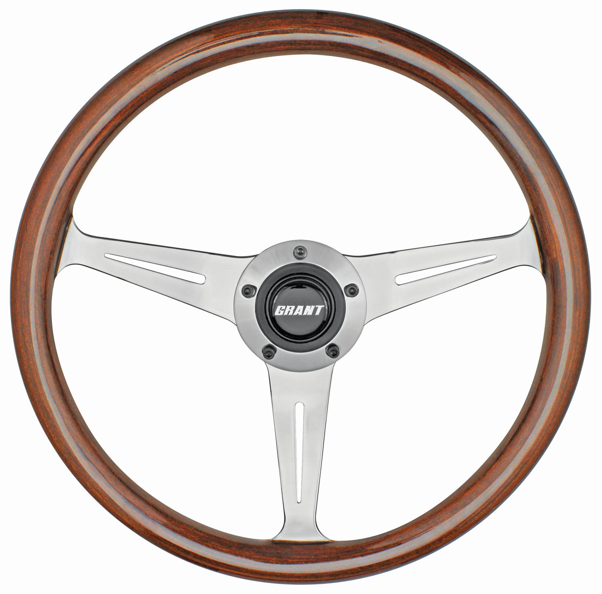 Machined aluminum, polished to a mirror finish, is the ultimate look for any street rod or street truck. Grant offers top-of-the-line series of steering wheels and accessories...designed for the ultimate car or truck enthusiast...THE COLLECTOR. This slotted three spoke wheel features Grant's exclusive, three-dimensional, dual-plane spoke design. The spokes are highly polished aluminum. The grip is a beautiful hand-rubbed mahogany wood with a deep, rich luster. Each wheel has a machined billet trim ring. A Grant Installation Kit is necessary to mount this wheel to a vehicle. This wheel will work with Grant Standard 3000 or 4000 Series, Billet 5000 Series, or Euro 6000 Series Installation Kits.