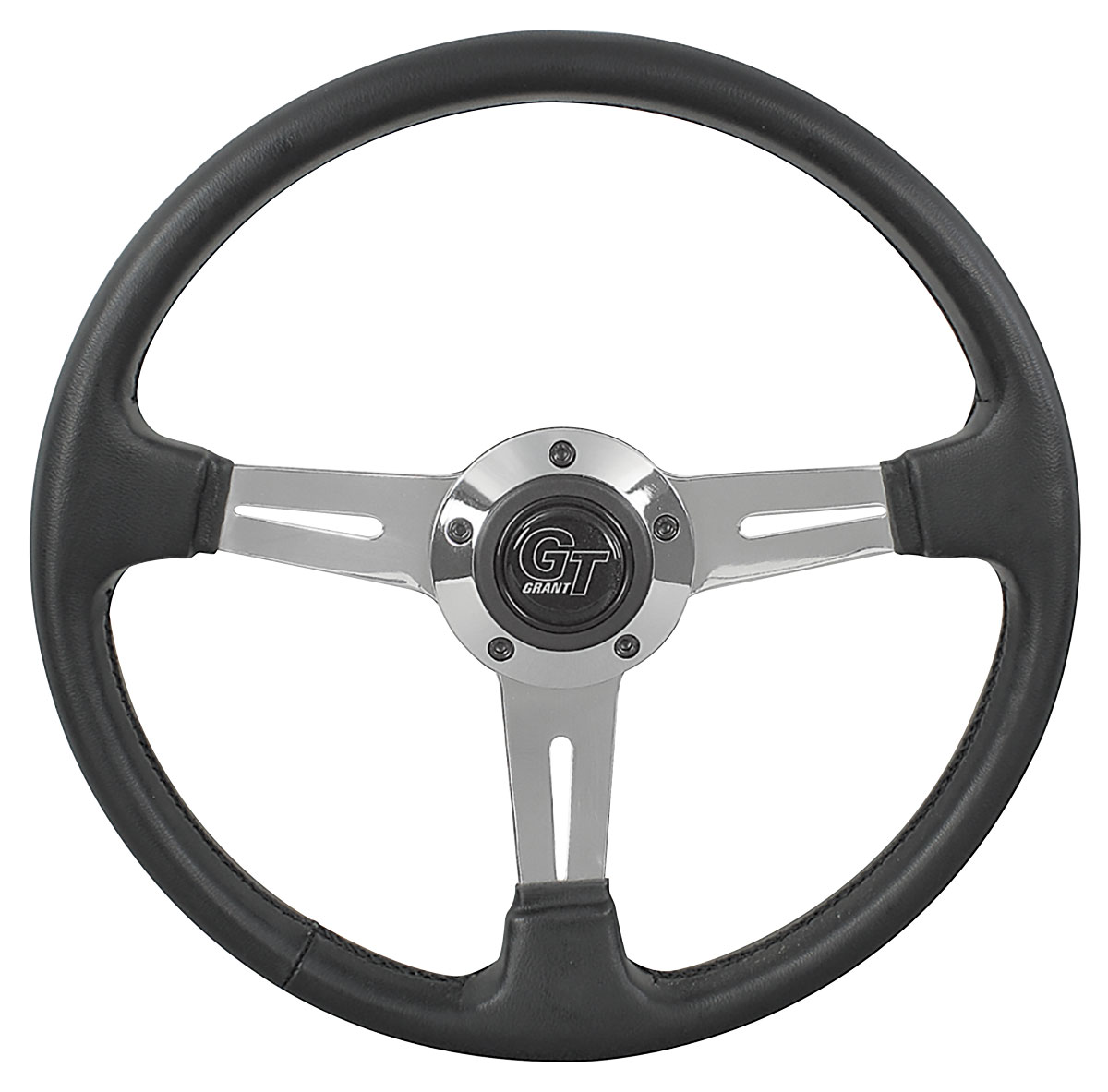 The “Elite GT” model is a highly polished aluminum 3-spoke wheel highlighted by a machined billet aluminum trim ring. This model features a hand-stitched, leather-grained vinyl grip and a matte black rubber styling sleeve. The Elite GT wheel is 14" with a 3-3/4" dish.