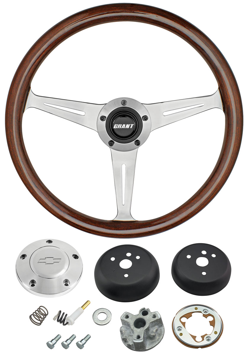 Steering Wheel Kit, Grant 3-Spoke, 1964-65 Chev, Mahogany w/Billet Bowtie Cap