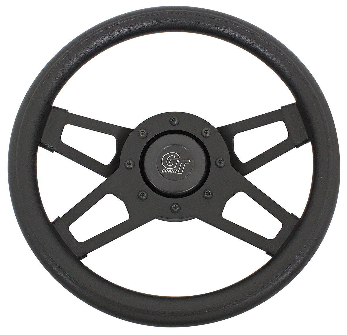 Grant now has available the “Challenger” series of steering wheels featuring their dual plane, 4-spoke design with three finishes available: black, chrome or satin spokes. They feature a thick, textured black foam grip with steel spokes and a 13" diameter with a 3" dish. They come complete with a horn button cap and an installation kit.