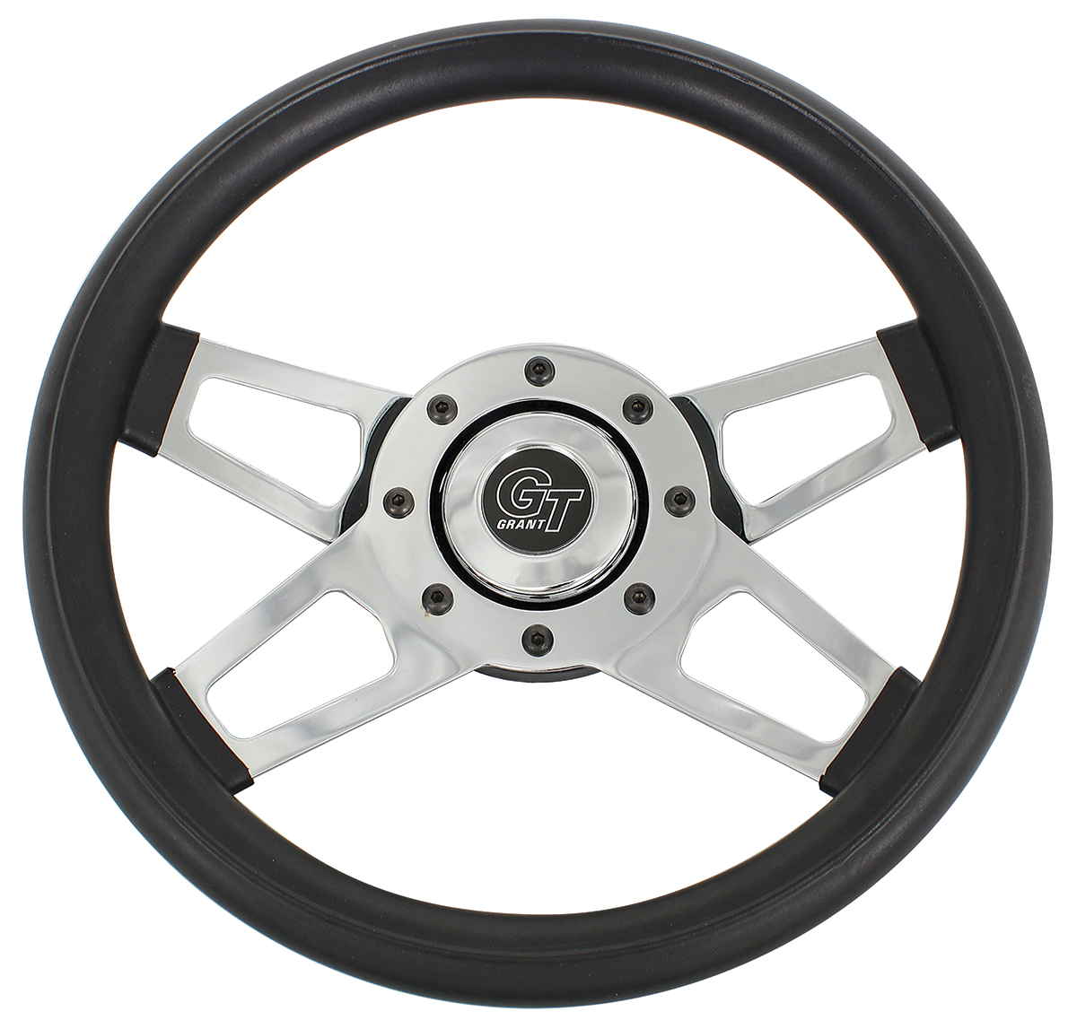 Grant offers the "Challenger" series featuring a dual plane 4-spoke design with three finishes available: black, chrome or satin spokes. They feature a thick, textured black foam grip with steel spokes and a 13" diameter with a 3" dish. They come complete with a horn button cap and an installation kit and will mount on any 1961-72 A-Body.