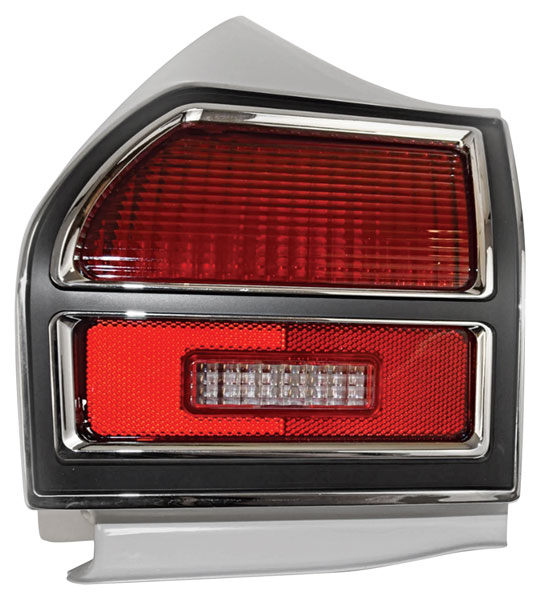 This reproduction tail lamp assembly is constructed to replace the originals exactly. Each assembly includes an Injection-molded housing with properly located mounting points and bulb openings, an acrylic lens for tail and backup lights as well as an OE-style reflector. The pre-installed die-cast bezels use durable chrome-plating for a mirror finish and correct black accent paint for a genuine appearance. Speed nuts are included for a hassle-free installation.