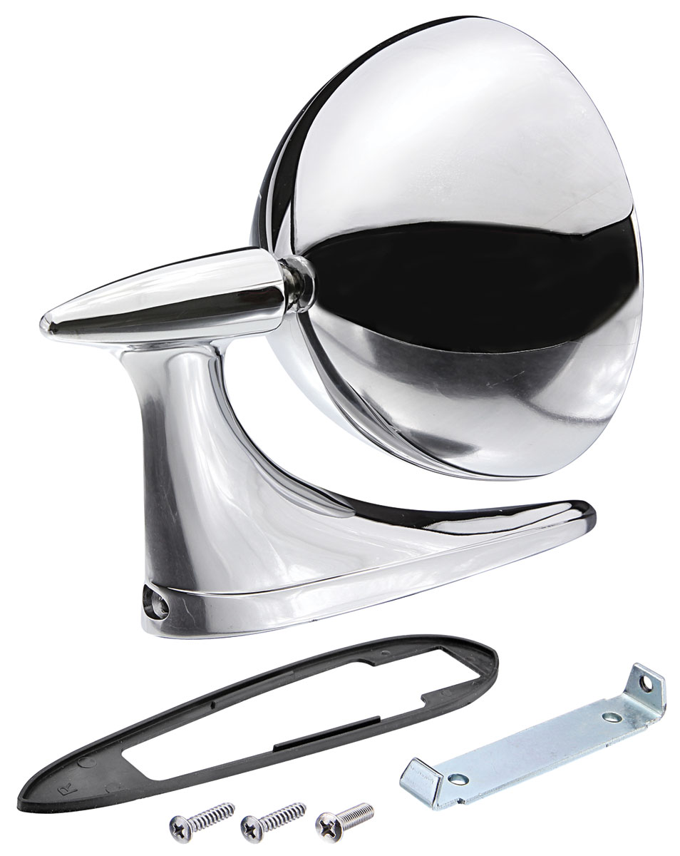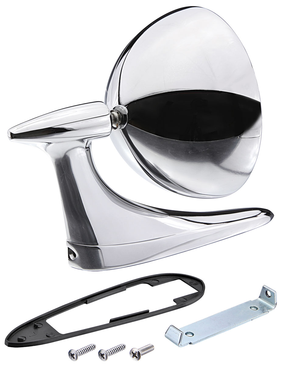 This premium reproduction mirror is an excellent addition to your restoration project. Manufactured to original specifications, each mirror features a durable die-cast base and housing. Each component is polished and chrome-plated for a show-quality finish, and each mirror includes a stamped steel mounting bracket, hardware and rubber gasket for straightforward installation. Available individually for left or right, as well as a discounted pair.
