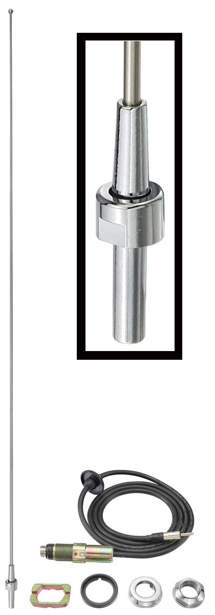 These complete assemblies include the mast, body, cable and antenna nut mounting kit. They mount on the front of the vehicle.