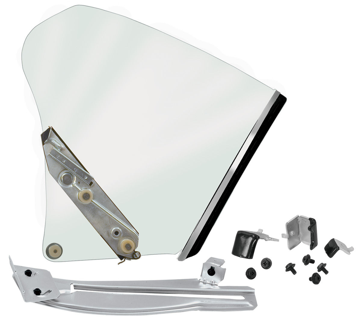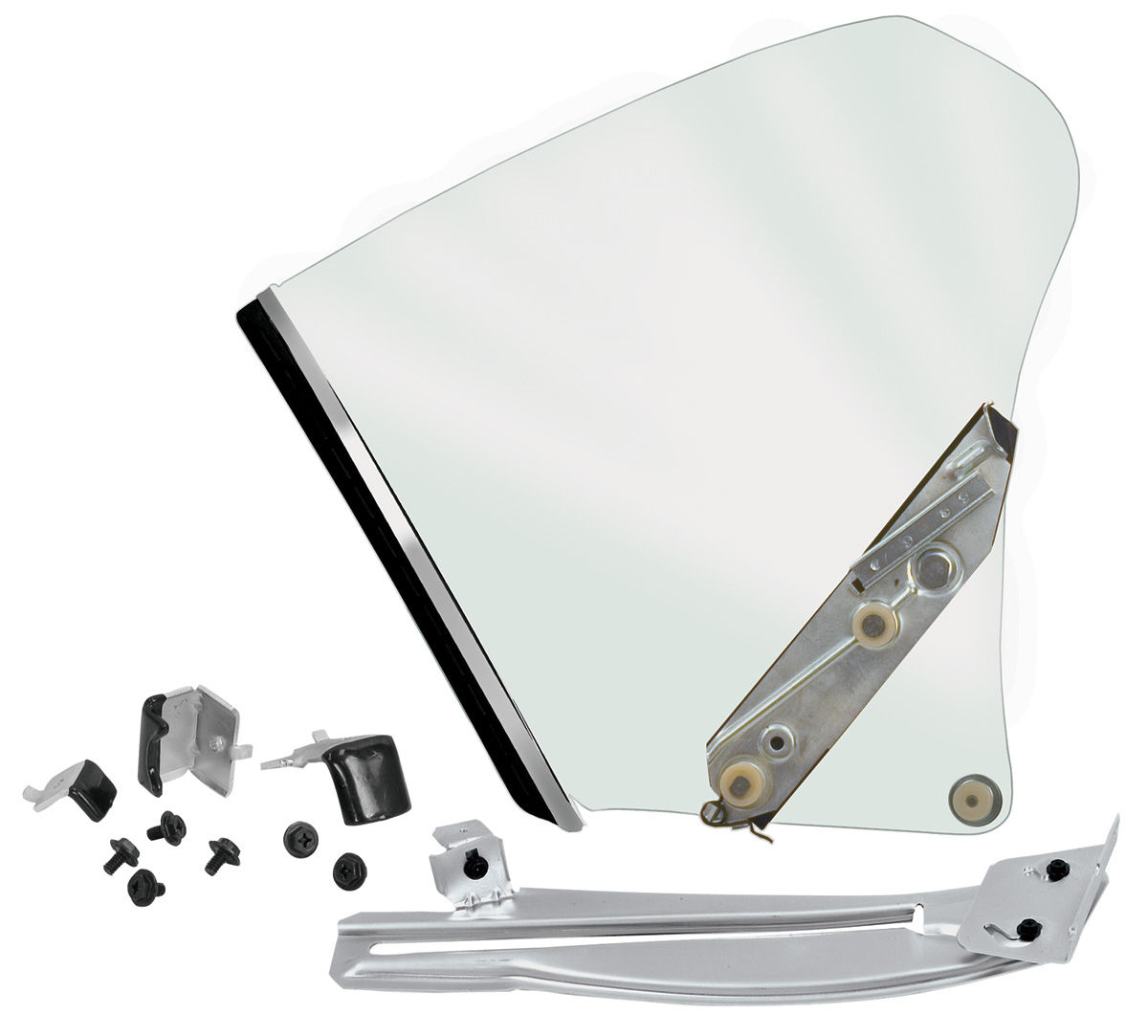 This complete quarter window assembly is ideal for any restoration. The assembly includes a new safety-tempered glass clear window complete with chrome trim and weatherstripping as well as the steel guide track and all of the necessary stops and hardware for a hassle-free installation.